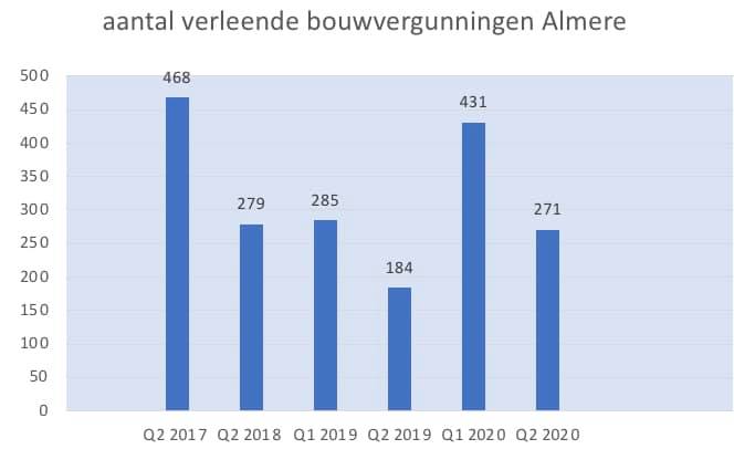Het aantal verleende bouwvergunningen nieuwbouw in Almere 2e kwartaal 2020 (271) stijgt weer ten opzichte van het 2e kwartaal 2019 na een diep dal van 2 jaar. Ook landelijk stijgt het aantal verleende bouwvergunningen met 8%.