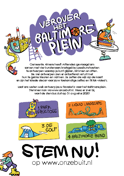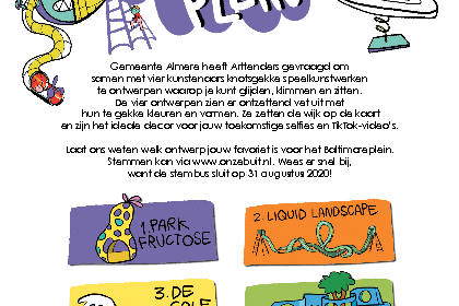 Op verzoek van de gemeente Almere realiseert creatief bureau Arttenders op het Baltimoreplein in Almere Buiten een kunstzinnig speelobject. Vier titels dingen mee naar de overwinning: Park Fructose, Liquid Landscape, De Golf en Baltimore Bend. Stuk voor stuk tot de verbeelding sprekende ‘playscapes’ die bezoekers uitnodigen tot interactie, sport en spel. De kunstenaars? Die blijven voorlopig anoniem, zodat iedereen onbevooroordeeld z’n stem kan uitbrengen.