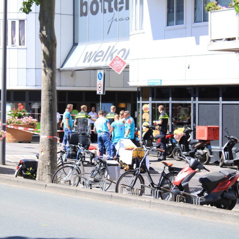 Bij het steekinsident is een persoon gewond geraakt. Het slachtoffer ligt bij de bottelaarspassage. De trauma-arts van de lifeliner verleent hulp aan het aanwezige ambulance personeel. Er zijn meerdere ambulances aanwezig. Verdere informatie ontbreekt
