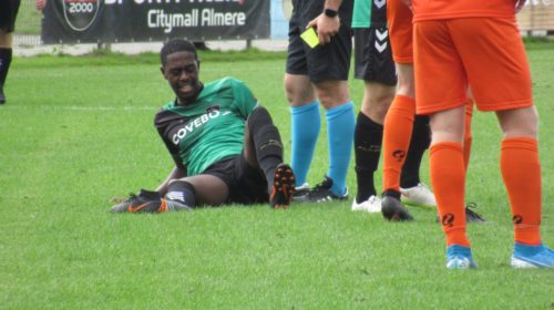 Foto: Soms ging het er fors aan toe bij FC Almere tegen Montfoort, dat ondervond ook Devinjo Plet van Almere.