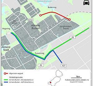 Verkeer op de A27 richting Almere Buiten Oost/Oostvaarders en industrieterrein De Vaart wordt eveneens omgeleid via de A6 afslag Almere Buiten en de N703 Tussenring.