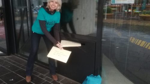 Op een druilerige zaterdagmiddag, werd door vrijwilligers van de stichting Geen Drugs-Wel Leven bij het Stadhuis in Almere Centrum een informatiepakket over drugsvoorlichting in de bus gedaan, gericht aan burgemeester Franc Weerwind en wethouder van onderwijs, Roelie Bosch.