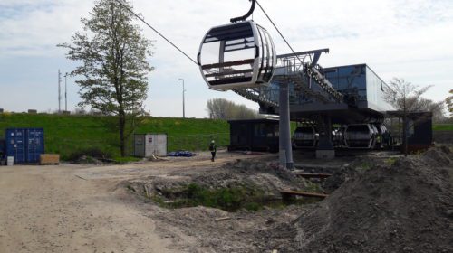 De kabelbaan met transparante gondels is een van de eyecatchers van de Floriade. Straks kunnen bezoekers van de parkeerplaats aan de kant van Almere Haven naar de entree aan de andere kant van de snelweg worden gebracht, zwevend boven de grond in een gondel.