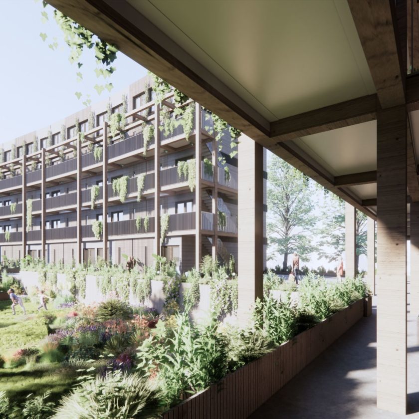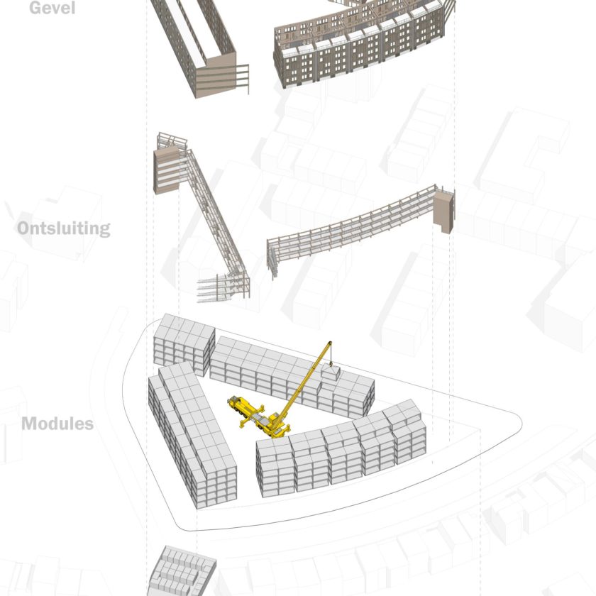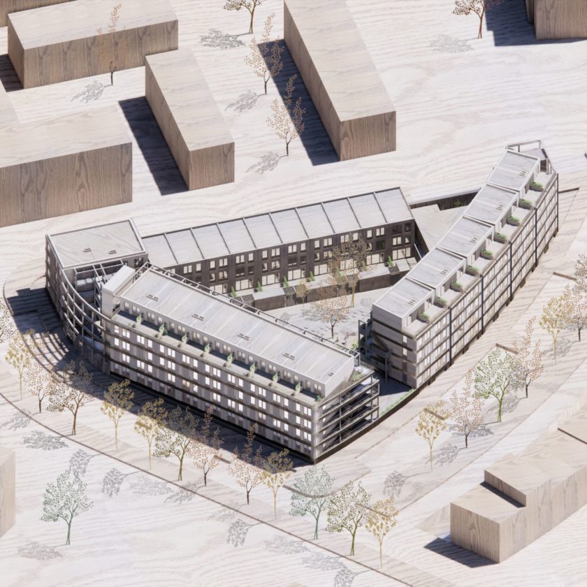 Dit bestaat uit ruim 430 circulaire houten modules, die na plaatsing een appartementengebouw met 93 appartementen en 10 grondgebonden woningen opleveren.