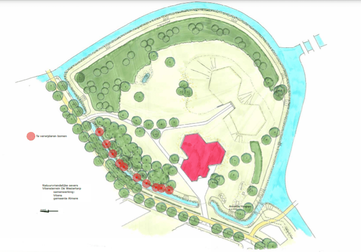 U gaat een aantal werkzaamheden zien die dit mogelijk maken. Eerst worden er een aantal bomen weggehaald om meer ruimte te maken. Op onderstaande tekening is te zien welke bomen worden weggehaald. De werkzaamheden starten waarschijnlijk in de komende weken.