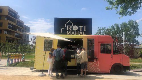 Het ondernemersplein, het horecaveld of gewoon ‘ons pleintje’. De Almeerse horecaondernemers in het Urban District op Floriade hebben de stemming er goed in zitten. De foodtruck Roti Mahal draait zelf een muziekje nu het even stilgevallen is op het grote podium in het midden, en spekkoekverkoper Ashley maakt vrolijk een praatje met zijn collega’s. “Er heerst hier de hele dag een festivalsfeertje,” vertelt ondernemer Agatha Tan.