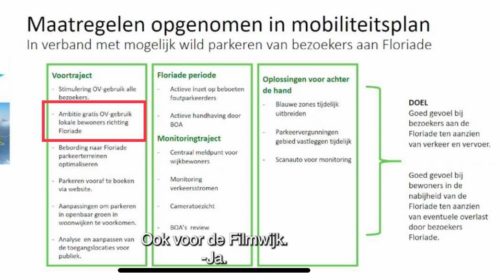 Keolis geeft desgevraagd aan dat zij bezig zijn met de gemeente / Floriade hier oplossingen voor te zoeken. De Floriade zelf adviseerde bij het kopen van het entreebewijs een parkeerkaart aan te schaffen voor het grote parkeerterrein langs de A6. Zo is gratis vervoer met de pendelbus naar de entree toch mogelijk. Een vreemd advies en niet bepaald ‘gratis’ als je €14,50 extra voor een parkeerplaats moet betalen om ‘gratis’ naar de Floriade gebracht te worden. Wreekt zich hier de haast waarmee het mobiliteitsplan totstandgekomen is?