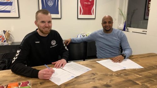 Foto: Nick van Beek tekent zijn nieuwe verbintenis en wordt geflankeerd op de foto door Mo Hersi, Hoofd TC Bovenbouw.