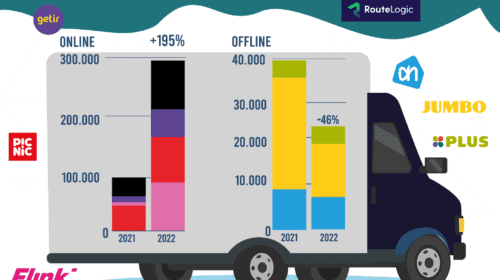 De consument zoekt namelijk in Google maandelijks (veel) meer én steeds vaker naar de services van een online supermarkt. Online supermarkten als Picnic en Flink krijgen de voorkeur boven de bezorgservices van de traditionele supermarkten wanneer de consument op zoek gaat naar een boodschappen bezorgservice. In 2021 wonnen de online supermarkten al van de traditionele supermarkt, maar in 2022 lijkt de genadeklap gegeven te zijn. In een jaar tijd groeide het zoekvolume van de vier grootste online supermarkten met 195%, blijkt uit het onderzoek. Dit terwijl het zoekvolume van de bezorgservices van de drie grootste fysieke supermarkten daalde met 46%.