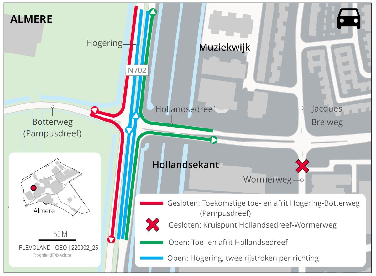 Omdat het viaduct nog niet klaar is, kan het verkeer nog niet vanaf de Hollandsedreef richting de A6 en ook niet vanaf Hogering Noorderplassen naar de Hollandsedreef. Om sluipververkeer in de Muziekwijk te voorkomen blijft het kruispunt Hollandsedreef-Wormerweg naar industrieterrein Hollandsekant nog dicht voor het verkeer. De omleidingsroute van en naar het industrieterrein blijft via de rotonde Hollandsedreef-Beemsterweg. De route vanaf het industrieterrein naar de A6 blijft voorlopig via de Havendreef en A6 toerit 3 Almere Stedenwijk. Naar verwachting duurt dit nog tot en met 31 januari 2023 als het viaduct wordt opengesteld.