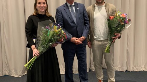 Fotobijschrift: Gedeputeerde Jan de Reus overhandigt bloemen aan Merel Rozier (Sweco) en Wouter Giessen (TripService)