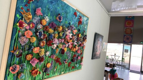 In deze mei-expositie krijgt de bloemenkunst een 2e bloei met origineel kunstwerk. Kleiner en soms driedimensionaal zoals de kunst met doppen van eierdozen gemaakt en handgeknoopt tapijt. Anders dus.
