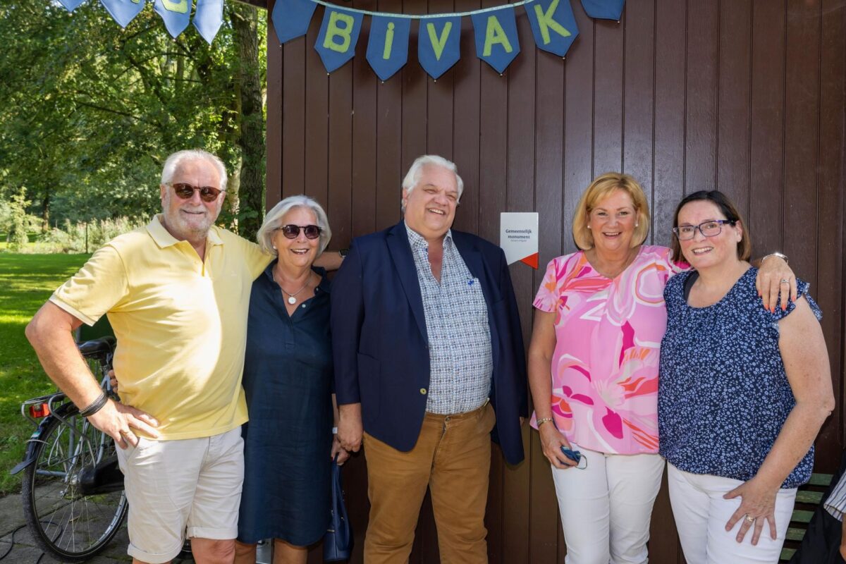 Boven: Wethouder Kees Ahles en oud-bewoonster Aukje van den Bos bij het Bivakhuisje na onthulling van het monumentenschild Beneden: Wethouder Kees Ahles in gezelschap van oud-bewoners van de Bivak: Gerrit en Elly Kool, Aukje van den Bos en Nicolet Leeman