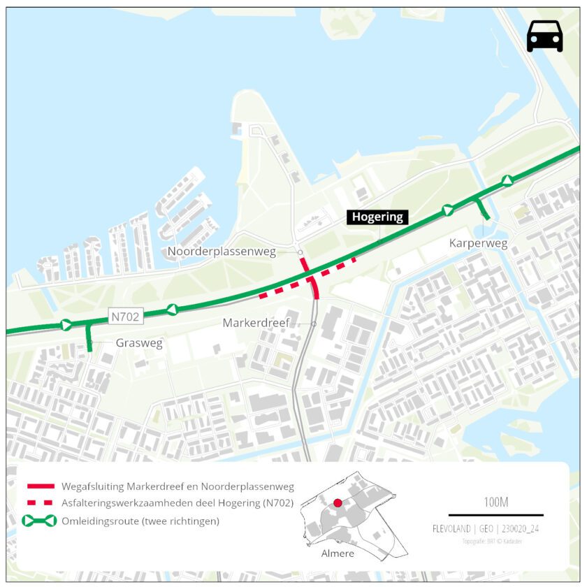 De kruising Hogering – Markerdreef is komend weekend vanaf de Markerkant volledig gesloten. De omleiding loopt via de Muziekdreef.