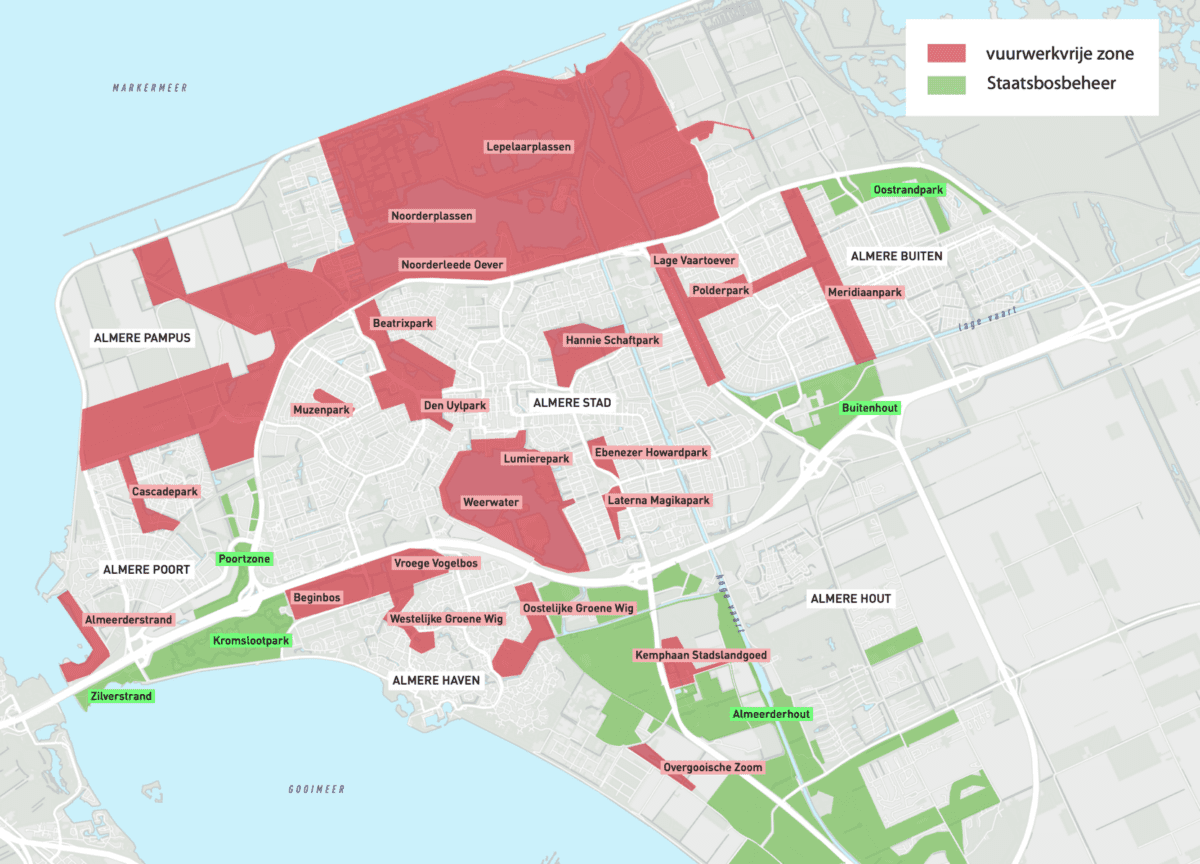 Zie voor meer informatie en een zonekaart de overzichtspagina op de website van de gemeente. In gebieden van Staatsbosbeheer, waaronder het Almeerderhout en de Oostvaardersplassen, was vuurwerk afsteken al niet toegestaan. Mensen die toch vuurwerk afsteken in een van de vuurwerkvrije zones riskeren een boete of, in het geval van minderjarigen, een Halt-traject. Alle bewoners krijgen in december een brief met uitleg. Vóór 18:00 uur op 31 december 2023 en na 2:00 uur op 1 januari 2024 is vuurwerk afsteken al verboden in heel Nederland.