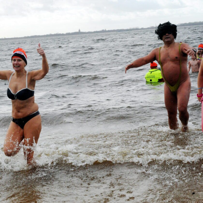 Zeker honderden waaghalzen hebben maandagmiddag de kou van het Gooimeer getrotseerd. Er was groot enthousiasme voor de Nieuwjaarsduik aan het surfstrand.