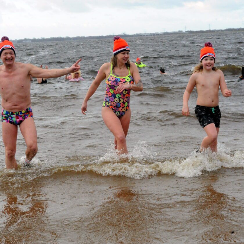 Er stond een straffe wind en de stoere ‘zwemmers’ moesten een lage temperatuur voor lief nemen. Desondanks bleef een klein groepje minutenlang in het water, tot ze door de Reddingsbrigade gemaand werden zich af te drogen.