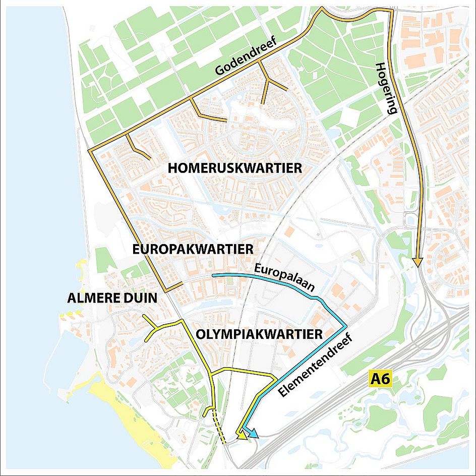 Op de Poortdreef van en naar de A6 is maar 1 rijbaan beschikbaar, normaal zijn dit er 2. De rijbaan naar Haven is afgesloten, omrijden kan via de Olympialaan. Als je Almere Poort in moet dan zijn 2 rijbanen open, dit zijn er normaal 3. Deze afsluitingen kunnen zorgen voor grote drukte op de weg. Volg de omleidingsroute op de kaart om files zo veel mogelijk te voorkomen. Ze verwachten dat de afsluiting tot half oktober duurt.