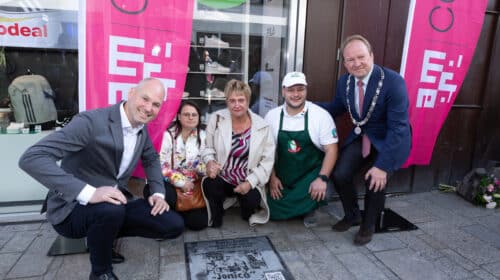 foto Burgemeester Hein van der Loo en Eric Zwart, directeur Rabobank Almere, samen met de familie van de overleden ijscoman Carlo Guida.