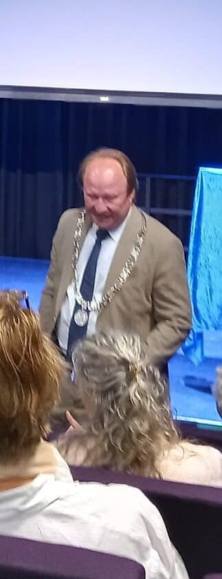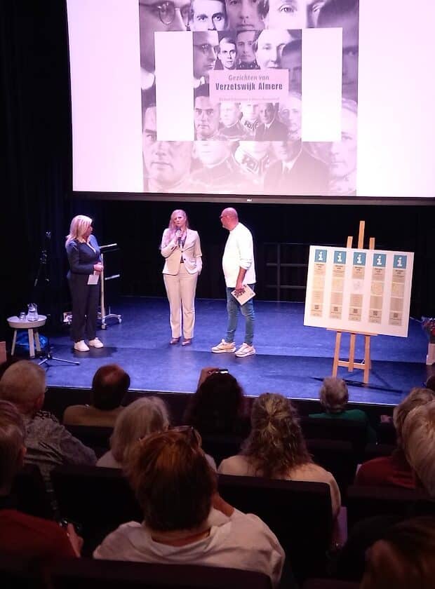 Burgemeester Hein van der Loo was natuurlijk aanwezig bij deze belangrijke presentatie. Belangrijk voor heel Almere (en meer). Hij kreeg het 1e boek uitgereikt. NB het logo voor het 4/5 mei Comite Almere is zo’n 20 jaar geleden ontworpen (gratis) door grafisch ontwerpster Judith Westerdijk