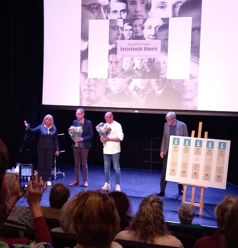 Vanzelfsprekend was ook het Stadsarchief Almere aanwezig, dus direkteur Erin Jansen op het podium, ook zij ontving een boek. Ook Kees Tak, namens het 4/5 mei Comite, werd op het podium gevraagd, waarna hij Marco Penninkhof en Richard Schuurman -symbolisch- maar een echt boeket overhandigde. De schrijvers meldden allebei dat ze hun boek opgedragen hadden aan Shira Waage, de onlangs onverwacht en veel te jong, overleden voorzitter van het 4/5 mei Comite Almere.