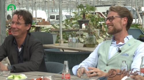 Vier stoelen en vier gasten tussen de planten van de Zorgkwekerij. Richard Haecke voorzitter van Almeerse Rotary en Golfclub Almerehout, weet alles over organiseren, Tineke…